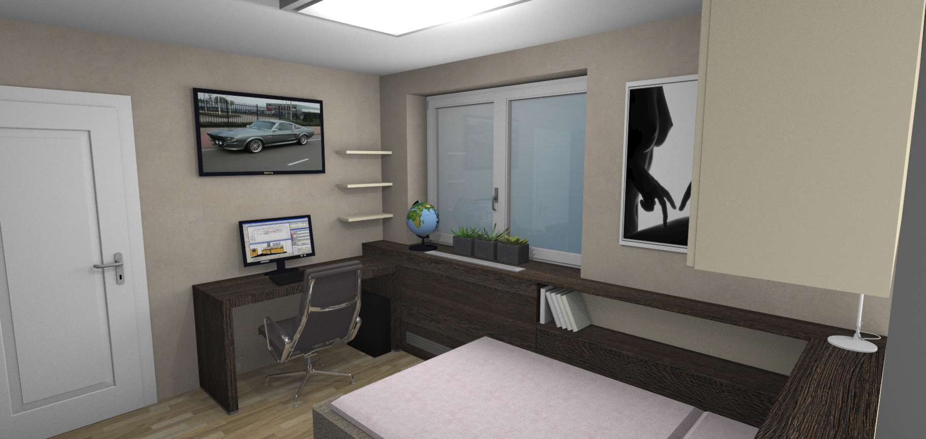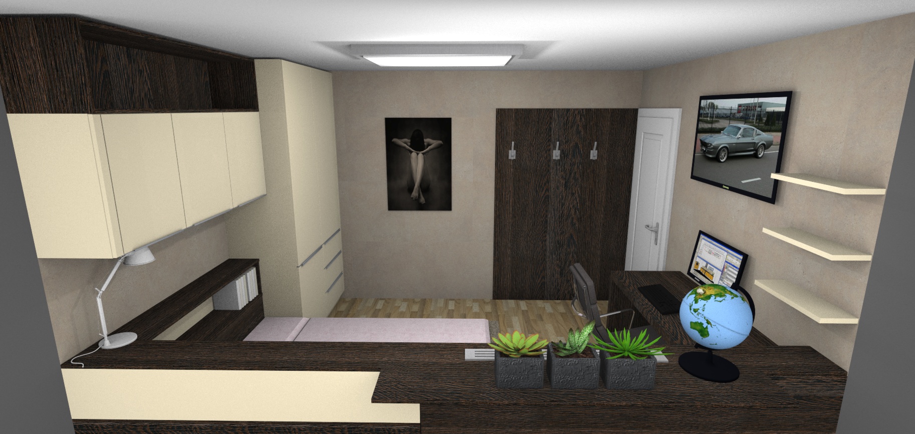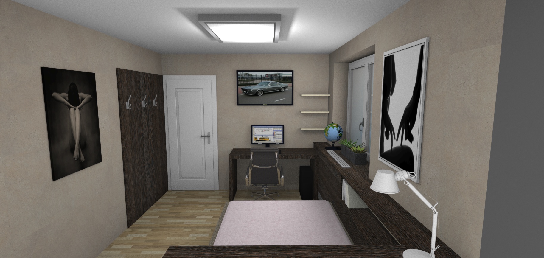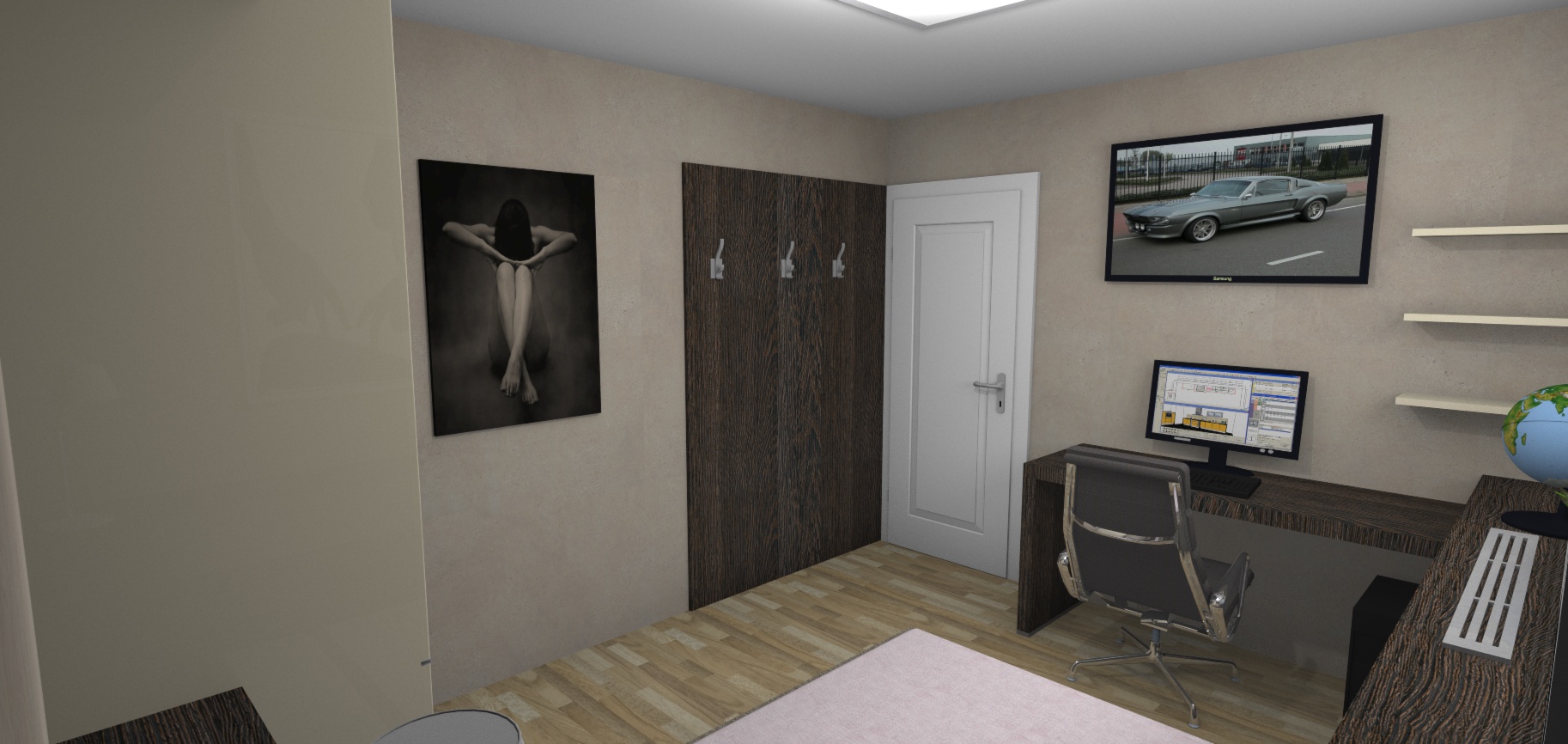 Taklhle nějak pokoj vypadá na které stěny by jste doporučili něco lepit ? (v místech těch dvou obrazu naproti sobě jsou prázdné stěny poličky jsou zaplněné.. tam bych to vylepil a pak za Monitorem a televizí (ta je nad monitorem..) je to dobrý plán ? nebo to nebude mít moc cenu když je tam ten věšák ? (vedle dveří ta tabule)