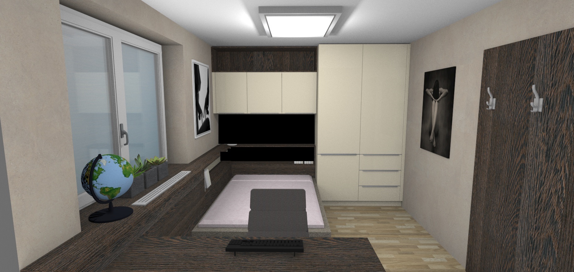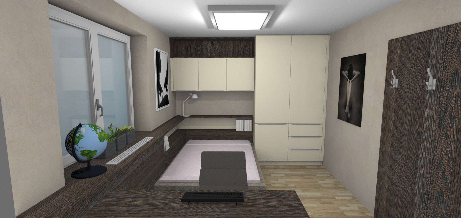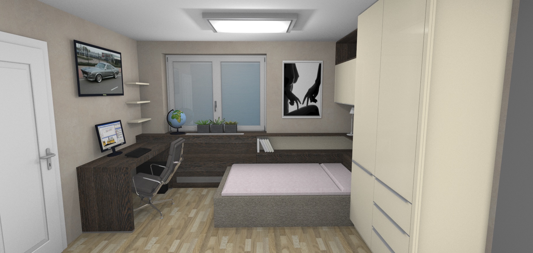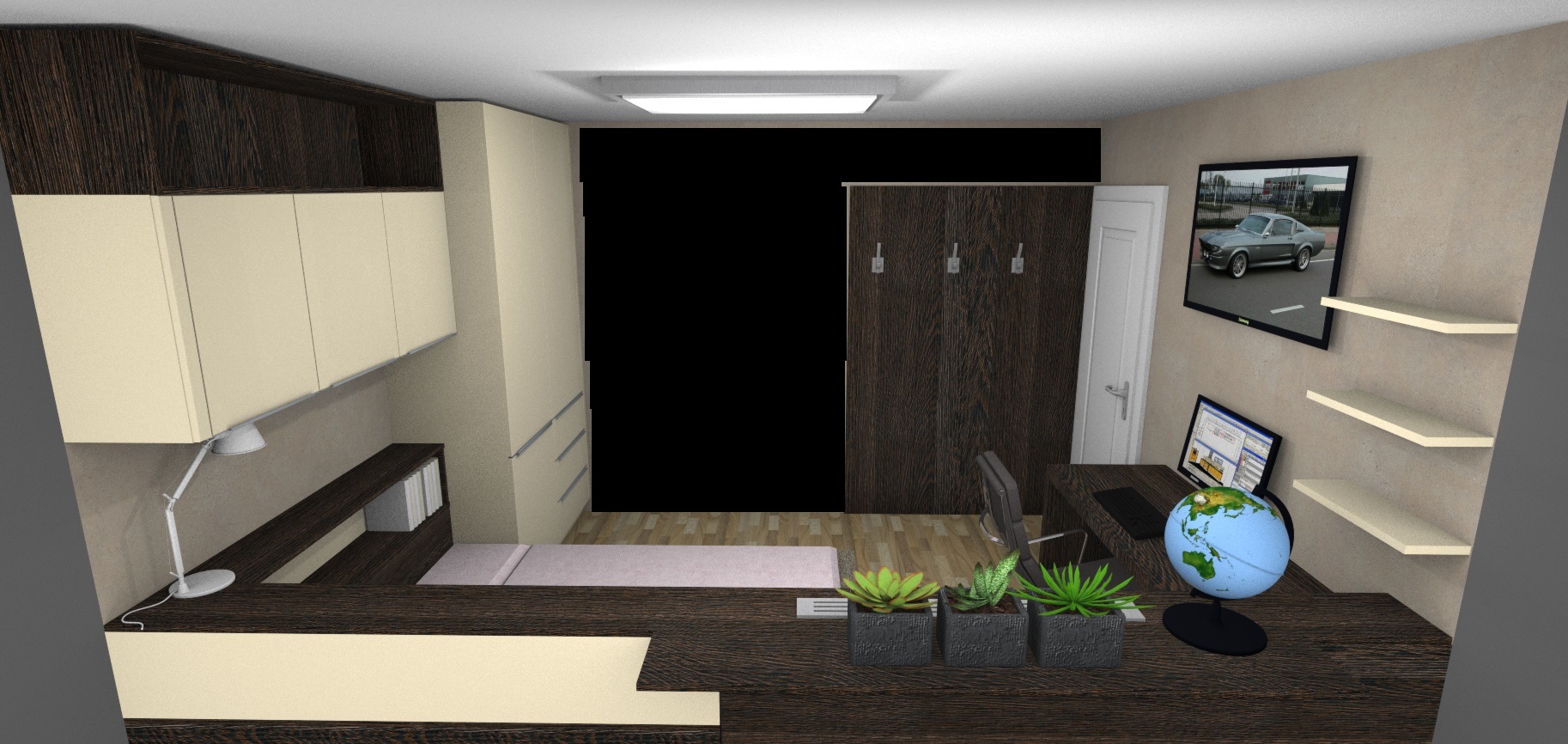 Taklhle nějak pokoj vypadá na které stěny by jste doporučili něco lepit ? (v místech těch dvou obrazu naproti sobě jsou prázdné stěny poličky jsou zaplněné.. tam bych to vylepil a pak za Monitorem a televizí (ta je nad monitorem..) je to dobrý plán ? nebo to nebude mít moc cenu když je tam ten věšák ? (vedle dveří ta tabule)