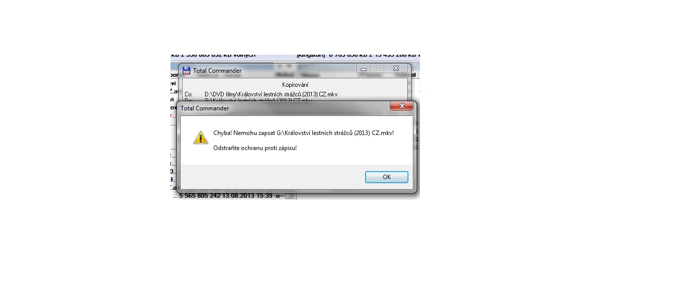 Chci si přesunout film (.mkv) na Flashku, kde mám přes 8GB volnýho místa. Film je v nejvyšší kvalitě a má něco kolem 5GB. Při kopírování přes TotalCommander mi to napíše " Chyba! Nemohu zapsat G:/Království lesních strážců (2013) CZ.mkv! Odstraňte ochranu proti zápisu!". Jak tedy mám tu ochranu odstranit? Díky předem.