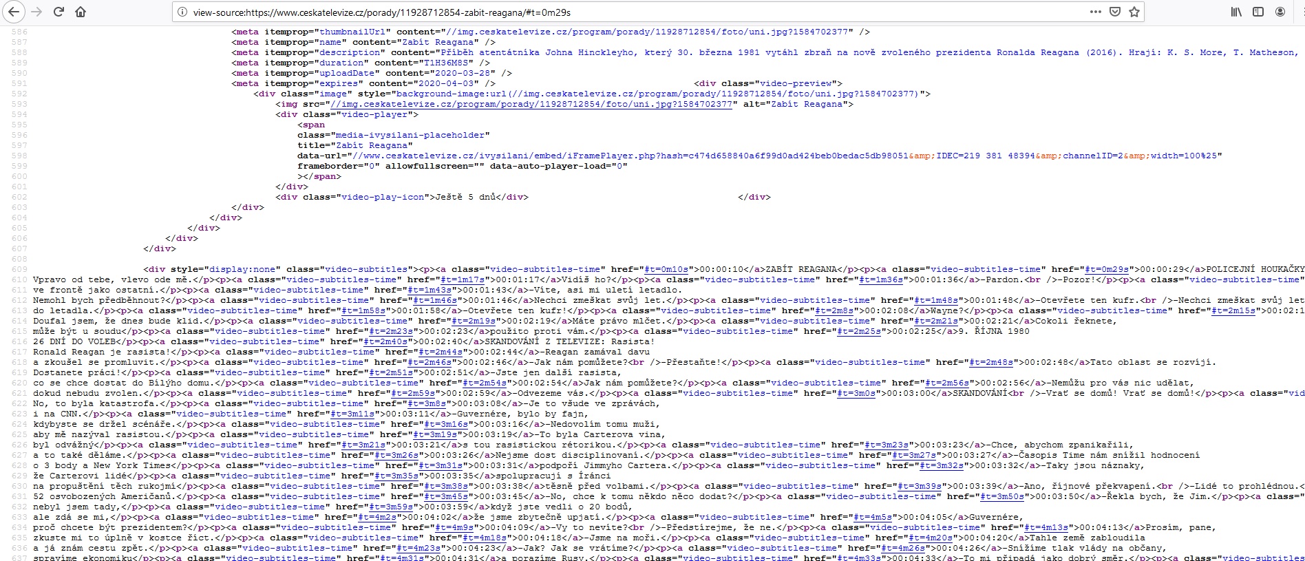 Hezký den, nevíte prosím někdo jak uspokojivým způsobem vytáhnout/extrahovat skryté titulky z ivysílání České Televize? Soubor videa se mi přes stahovače stáhne bez titulků, nicméně když si dám na příslušné stránce videa 'zobrazit zdrojový kód stránky', tak titulky najdu v HTML včetně časování - viz obrázek. Bohužel ale vůbec nevím, jak je převést do SRT aniž bych je celé znovu i s časováním nekopíroval.