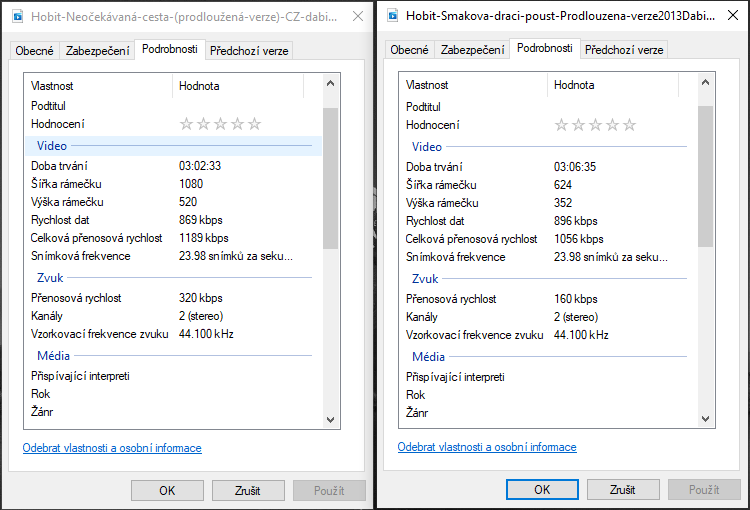 Přikládám screenshoty vlastnosti dvou filmů umístěných ve stejném adresáři, se stejnou příponou. Ten vlevo přehrát jde, vpravo nejde.