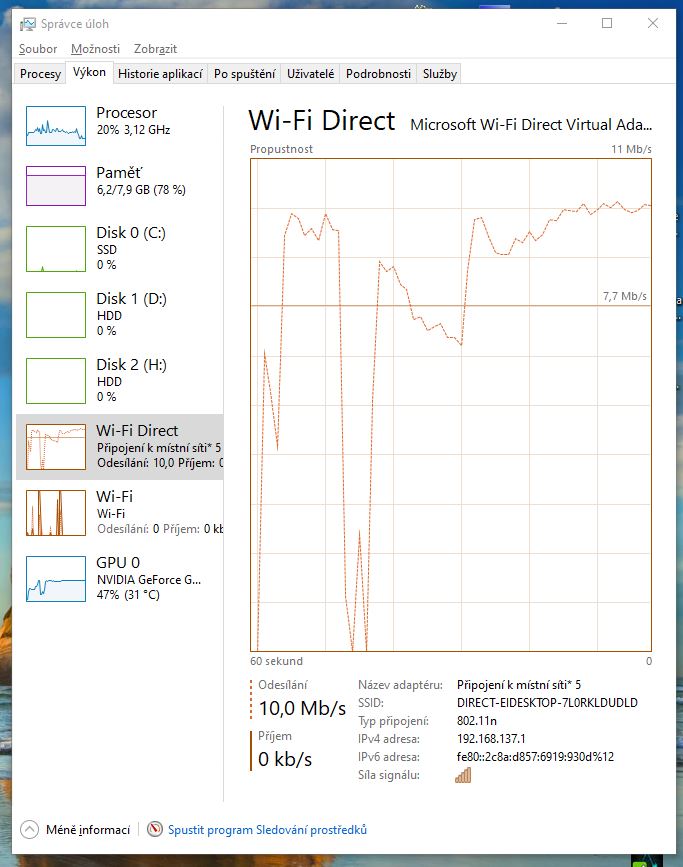 Zkoušel jsem to taky bezdrátově ale je to taky nestabilní. Asi mně nestíhá wifi v PC nebo nevím. Nepřipojí se to k pc pokaždé - někdy až napotřetí a pak při puštění filmu a přetáhnutí do TV ve správci úloh na PC jsem měl Wifi direct vysoce přes čáru, která je 7,7 Mb/s. Skákalo to až k 16 Mb/s, což způsobovalo brutální trhání.wifi v PC mám přes USB Tenda W322U Wireless-N USB Adapter