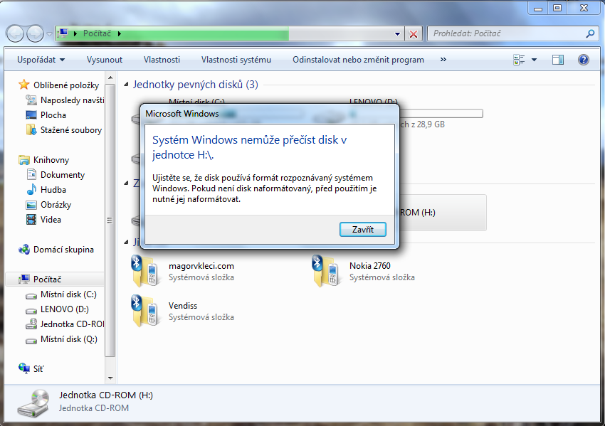 Dobrý den, mám problém s diskovou jednotkou, v Tento počítač mám zobrazeny dvě diskové jednotky a při tom mám nb Lenovo IdeaPad G560, kde je pouze jedna. a když vložím disk do diskety, a pokusím se otevřít v Tento Počítač diskovou jednotku, napíše mi to toto: (příloze). Nevíte jak to zprovoznit?