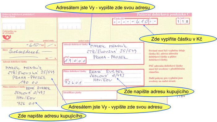 Jak píše Hoff.Dobírková poukázka/většinou C/kde napíšeš jakou částku chceš poslat atd a pak vyplníš podací lístek/malý bílý/,který se vypisuje k balíkům,doporučeným dopisům aj.