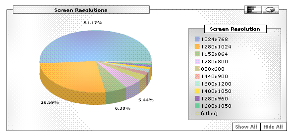 Ahoj ještě jednou, pc-help nyní nově využívá služeb Google Analytics, kde je možné analyzovat i rozlišení. Jak je vidět, s rozlišením 1024 x 768 sem chodí více než polovina návštěvníků, přizpůsobíme pc-help tomuto rozlišení - více viz níže uvedený graf :-)