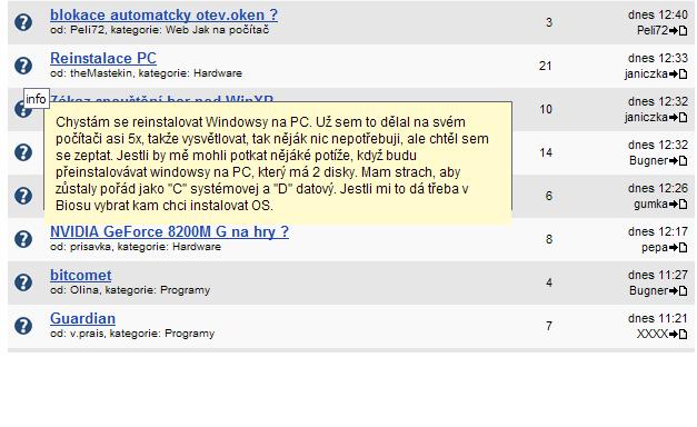 Nemusel by byt ani otaznik , stacilo by najeti na titulek a zobrazit 2-3 prvni radky. Po zalogovani by mohlo zobrazeni byt rozsireno o prvni 2-3 radky posledni odpovedi. Pro zorientovani postaci.
