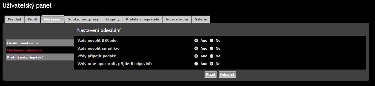 Zkus uživatelský panel, nastavení odesílání ..