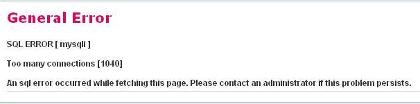 Ahojte všichni. taky jste měli včera problém se od 22:20 dostat na fórum? Vím, že ještě X měl stejný problém.Zkoušel jsem to i po půlnoci a pořád to nešlo. Vyskakovala chyba (viz. níže). Prý moc připojených lidí, ale podle statistiky tu včera rekord nepadl, tak nevím. Zajímalo by mě, pokud si tohoto všimne admin, kde byla chyba.