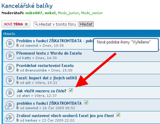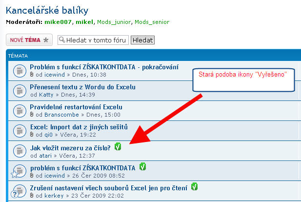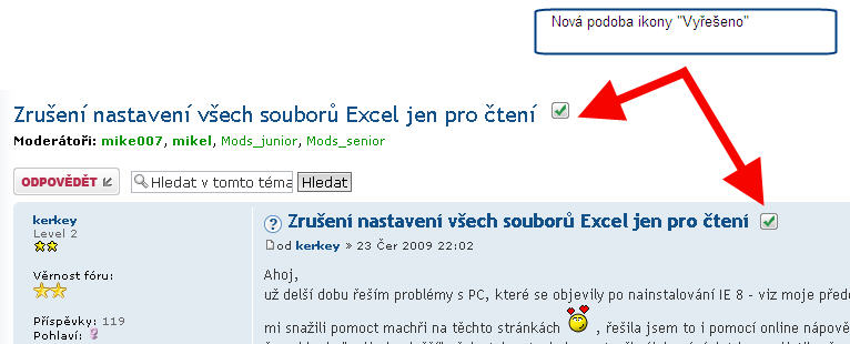 - pokud uživatel svůj příspěvek označí za vyřešený omylem, může požádat moderátora či admina o zrušení označení "Vyřešeno" (donedávna mohl upravovat pouze admin)