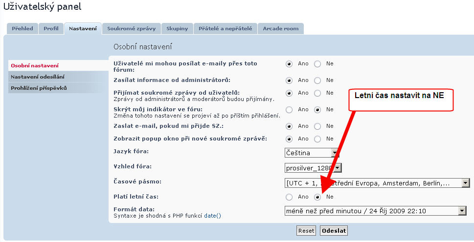 Uživatelský panel >> Nastavení >> Platí letní čas = NE