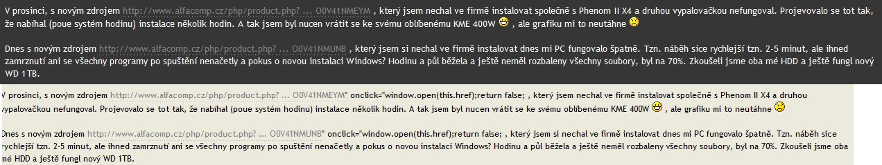 samotarrk píše:Také jsem si však všiml a pouze občas divné zobrazování odkazů, kdy sice odkaz funguje, ale podtržena je pouze polovina, druhá nikoliv. Snad nejsem jedinný a pokud Ltb o problému neví a jiní si toho také všimli ať mě doplní. Zde uvádím ve screenu svůj starý příspěvek, kde je odkaz OK a v jehož citaci je odkaz již s problémem i když funguje (náhodou?) blbě to vypadá.