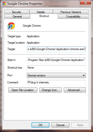 U zástupce na ploše a ve startu zkontroluj tuhle záložku a položku "cíl"
