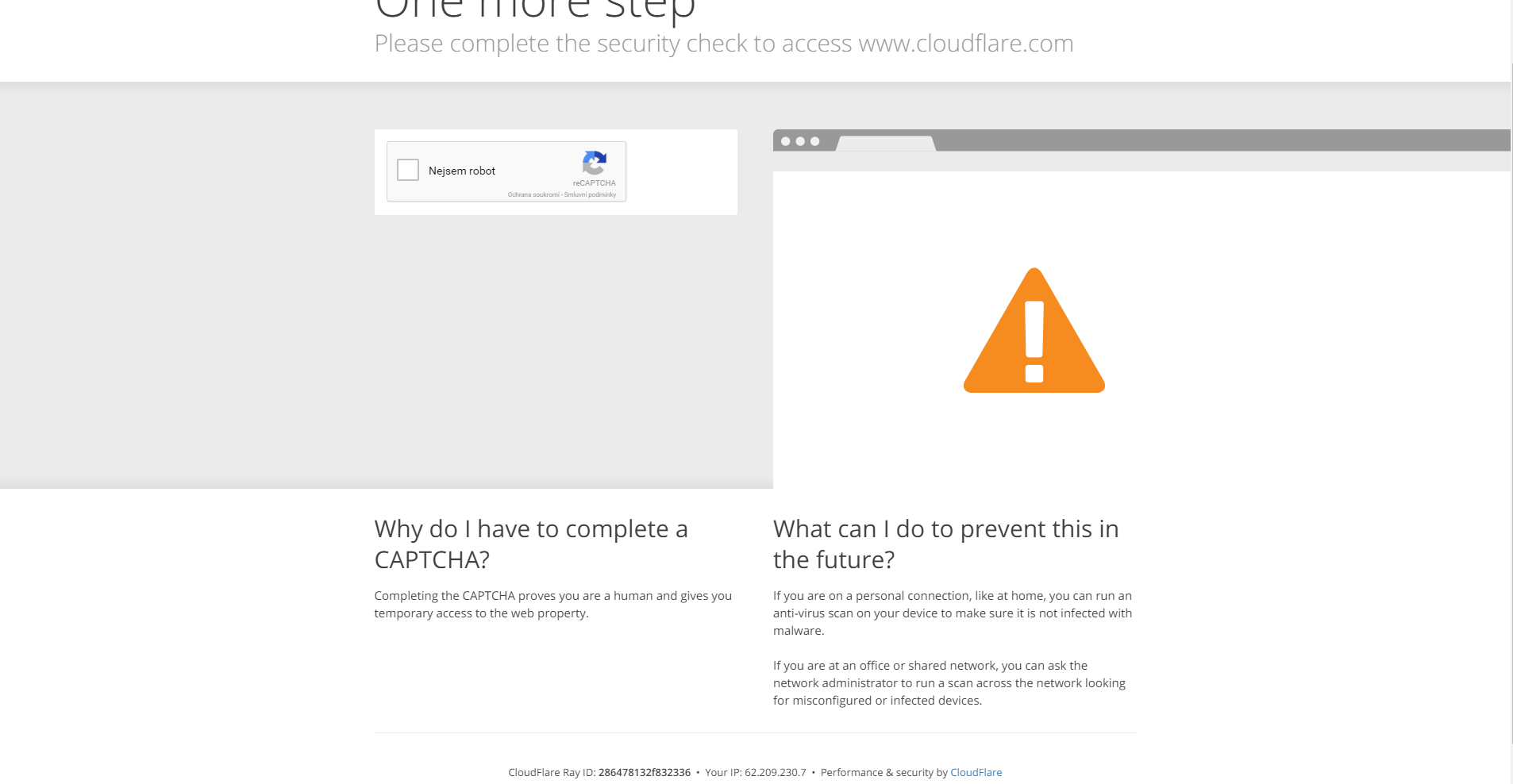 Je to jedna z ochran od Cloudflare proti útokům botů, DoSu a DDoSu. Pokud je web pod útokem, tak žačne filtrovat uživatele od botů pomocí captchy. Žádná změna IP nepomůže.