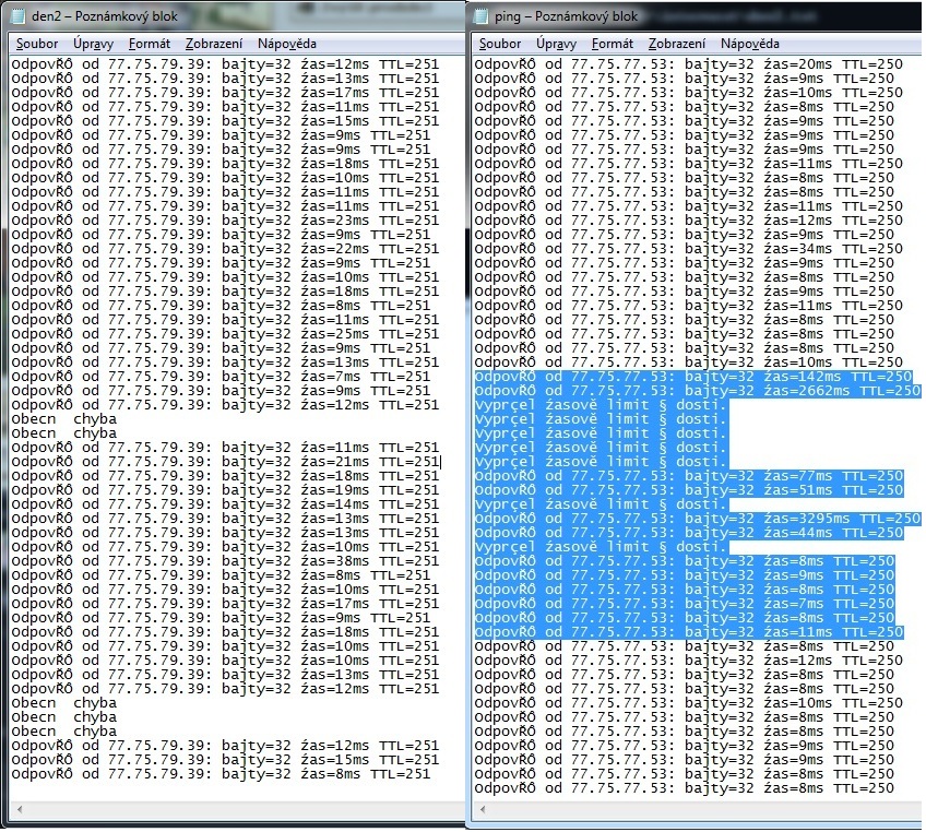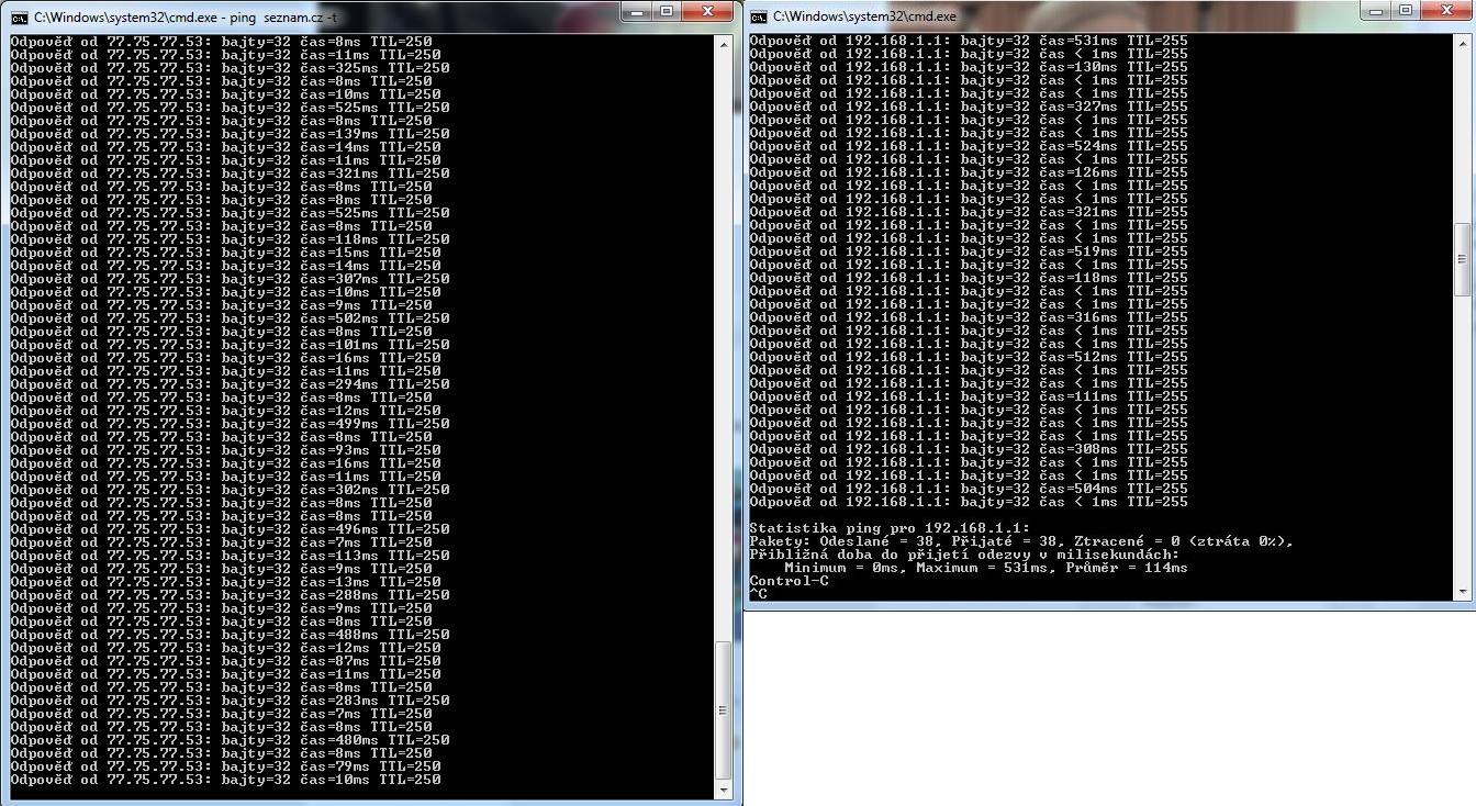 Příklad déle trvajícího přeskakování malých a velkých pingů. ( ping seznam.cz -t),