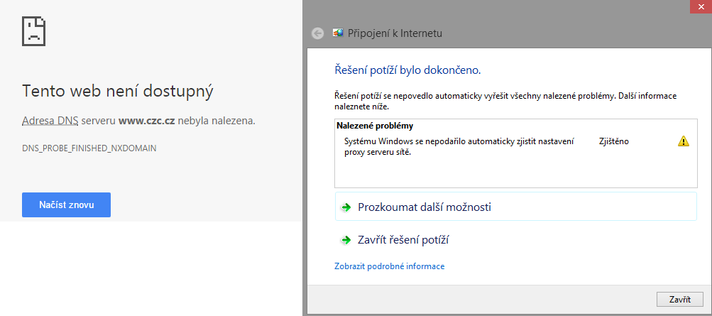 Zdravím, mám takový problém, že na některých stránkách například CZC mi to píše hlášku "Adresa DNS serveru http://www.czc.cz nebyla nalezena.". Neděje se to jen na mém PC, ale i na mobilu, notebooku, no prostě kdekoliv, kde se připojím na naší Wi-Fi, když hledám CZC na datech v mobilu, tak to jde bez problémů. Neděje se to na všech stránkách, děje se to zřídka. Zkoušel jsem vypnout a zapnout router, změnu prohlížeče, diagnostiku a poradce při potížích s internetem (který je ve Windowsu), našlo to chybu, ale neopravilo ji, viz v příloze. Nic z těchto věcí nepomohlo. Takže přišla řada na optání se zkušenějších, co s tím.