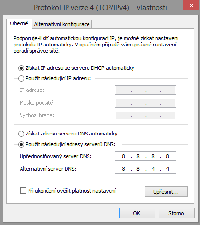 Edit: Tak mezitím, co pořád čekám na rady, tak jsem ještě googlil, jako před tím, než jsem dotaz napsal, ale teď jsem našel více a to to, že mám v Centrum síťových přípojení a sdílení -> Wi-Fi stav -> vlastnosti -> Protokol IP verze 4 -> vlastnosti. Změnit z "Získat adresu serveru DNS automaticky" na "Použit následující adresy serverů DNS" a tam vyplnit 8.8.8.8 a 8.8.4.4, viz příloha. Toto jsem udělal, ale opět to nepomohlo.. :-/