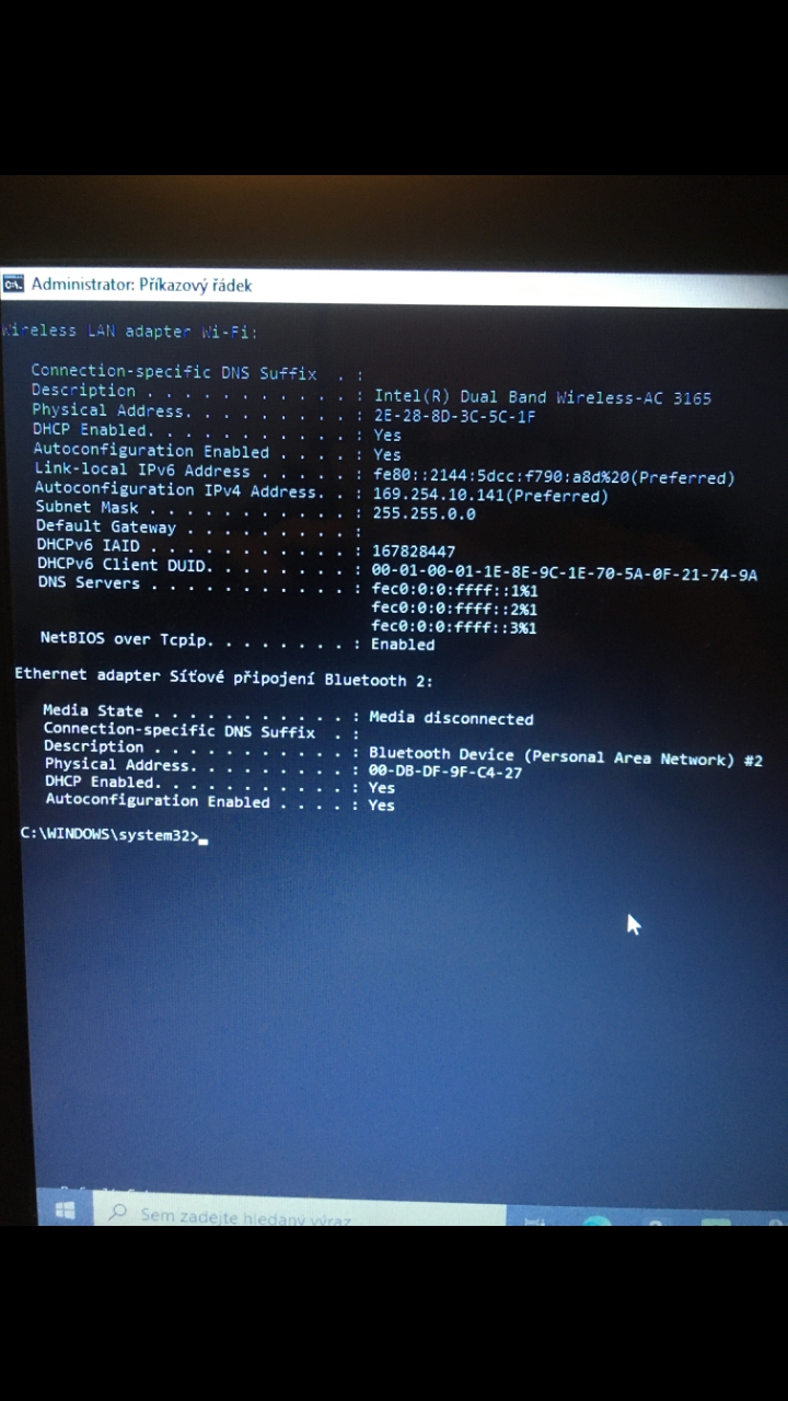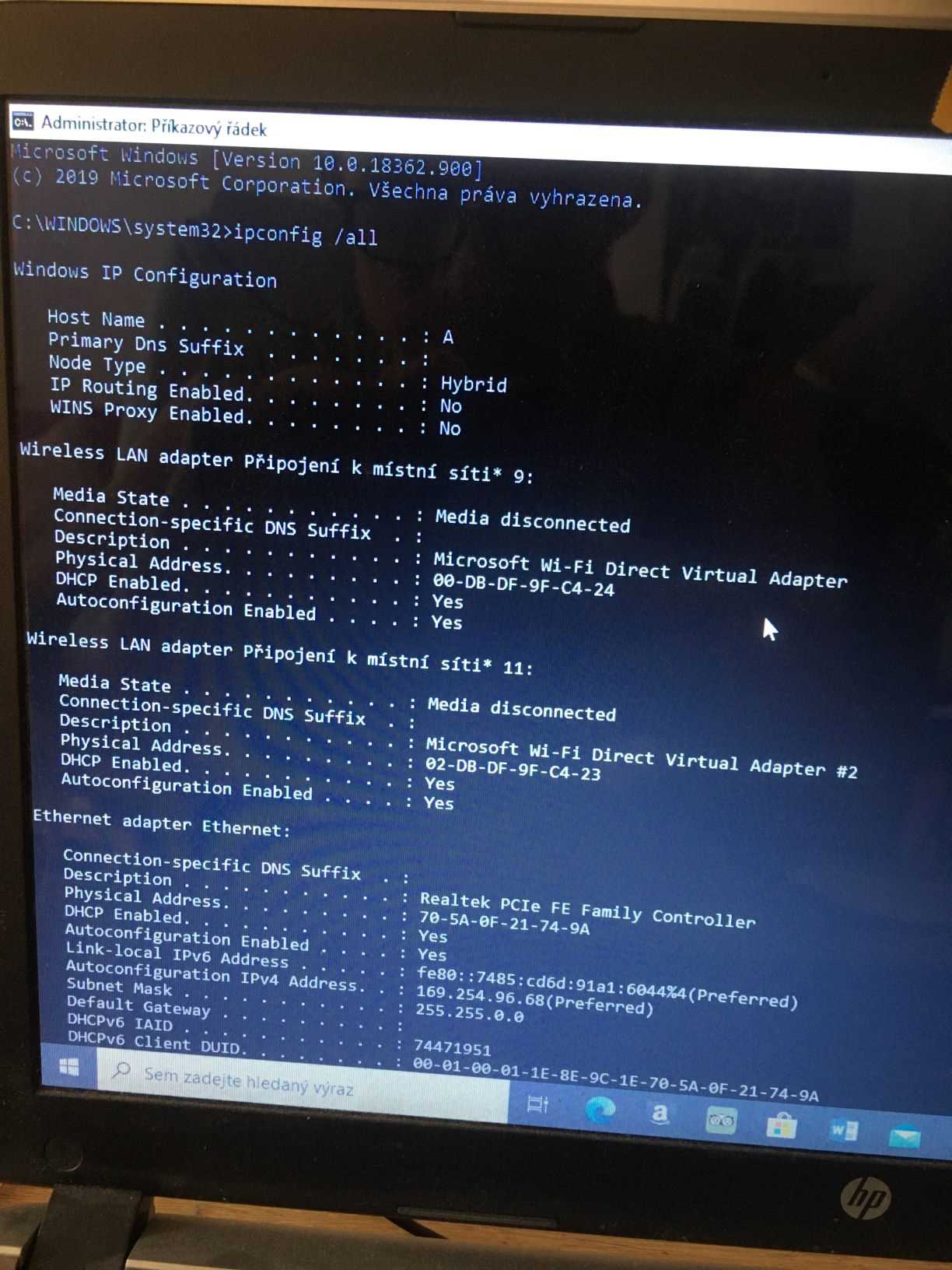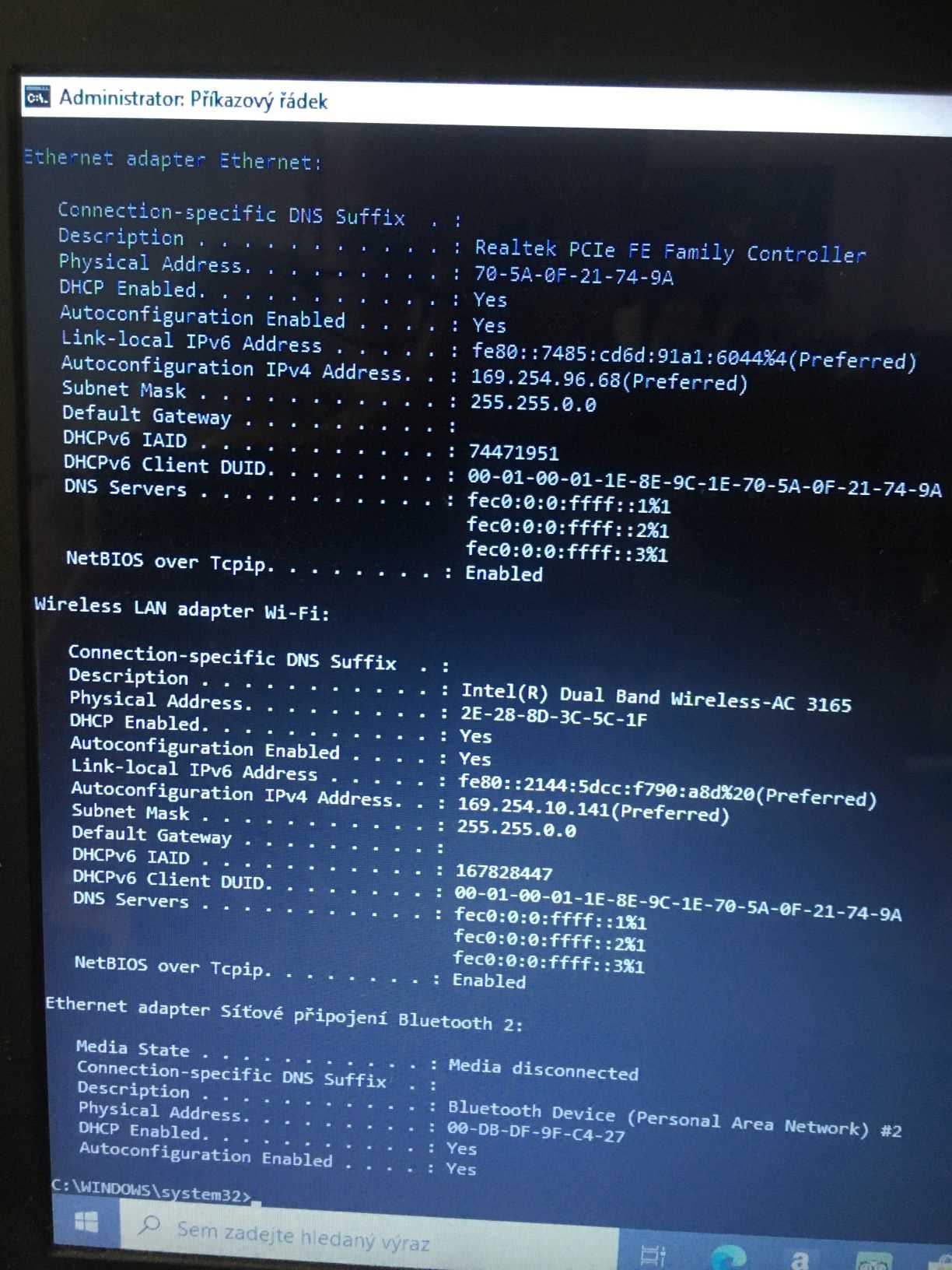 Dále sem dej ipconfig -all nějakého zařízení, které funguje.
