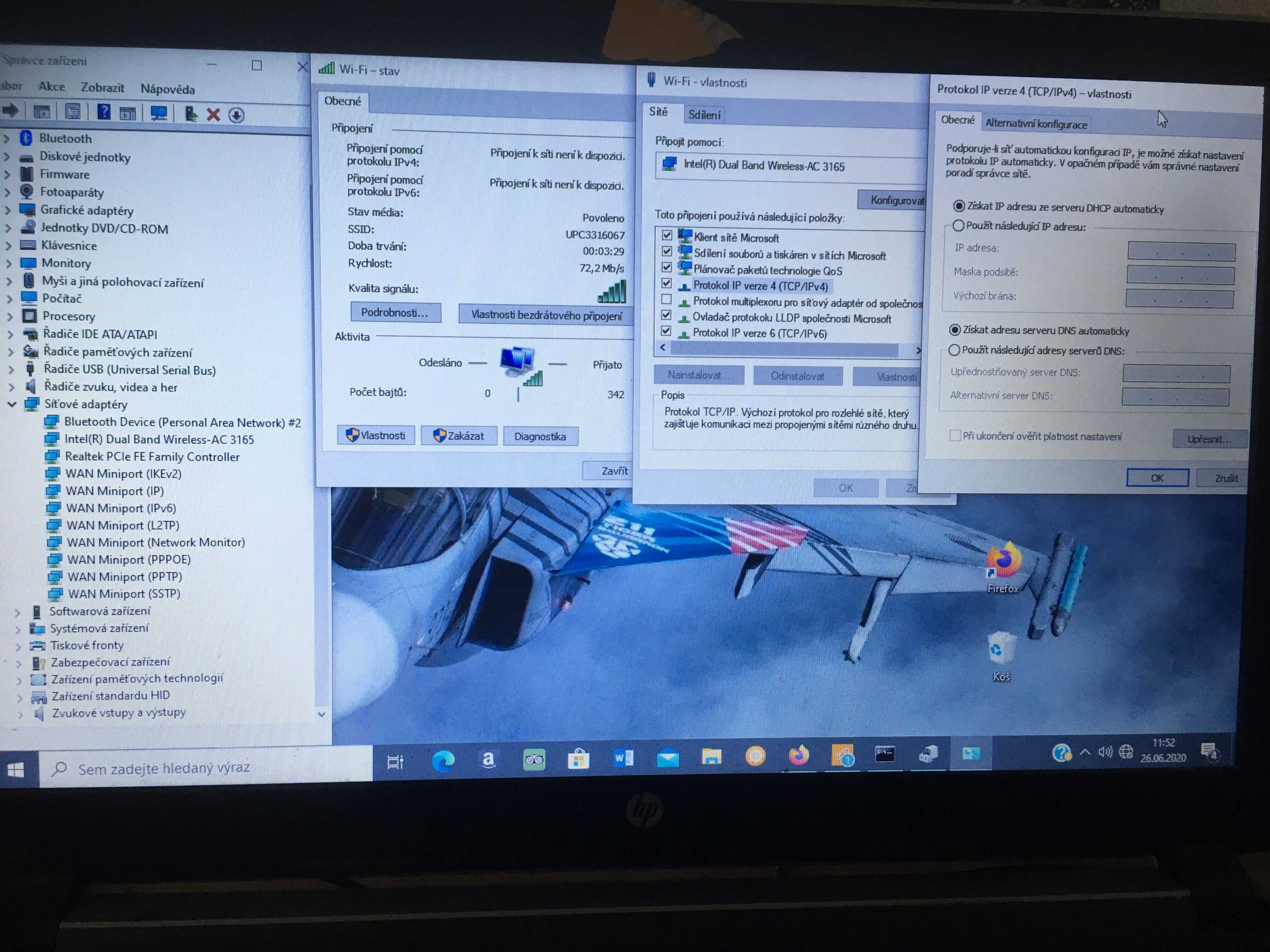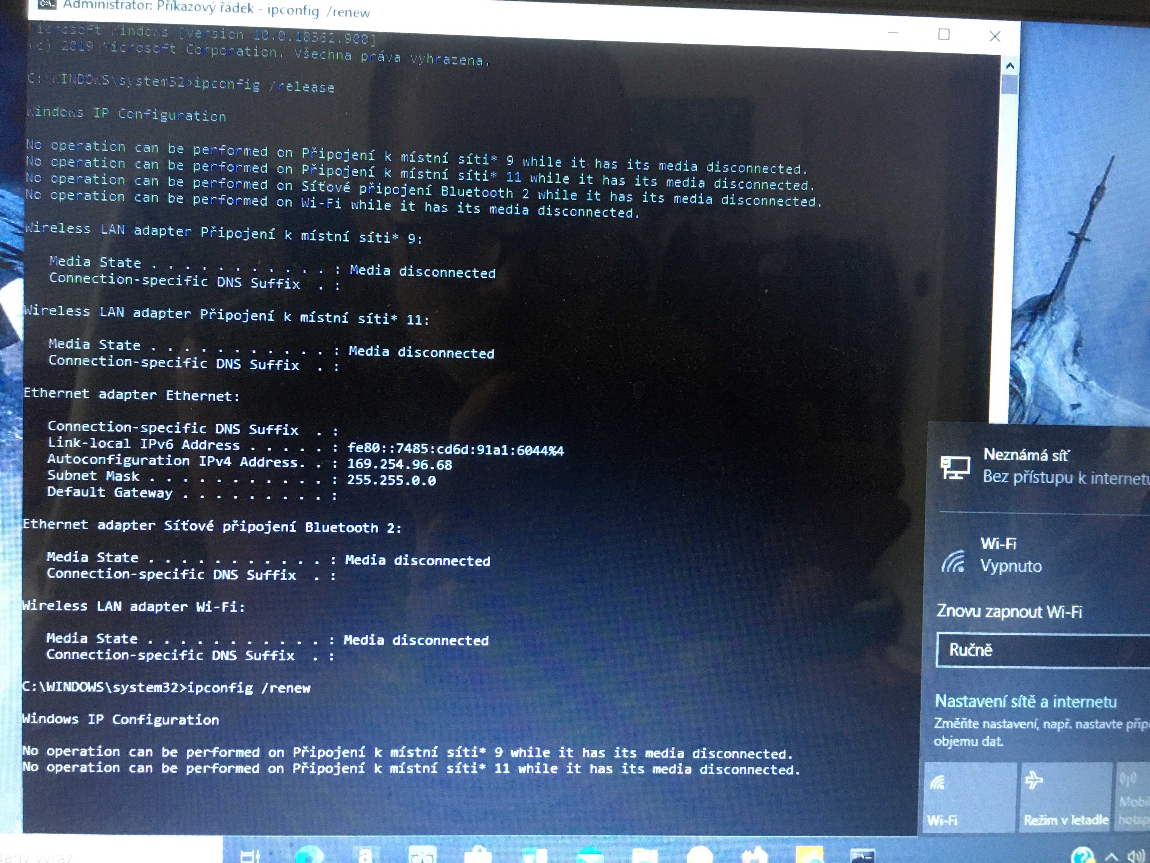 Vcera se mi prihodil takovy problem. Pravdepodobne se mi vecer stahly nejake “aktualizace” k sitovym ovladacum, na notebook protoze rano mi absolutne prestal fungovat interent, resp. Pripojeni k wi-fi. Modem by mel byt ale v poradku, s mobilem se k nemu pripojim bez problemu na druhou stranu kdyz jsem si s mobilem chtel vytvorit hot spot na notebook, abych nouzove nasel nejake info, ani toto pripojeni nefunguje tzn. Notebook je uplne hluchy. Pri diagnostice site mi to vyhodilo log: Adapter Wi-fi nema platnou konfiguraci protokolu IP. Jiz jsem zkousel resetovat pocitac, modem vsechny mozne tutorialy ale nic nepomohlo muze mi nekdo poradit? Muj notebook je HP Pavilion S 64bit op. Systemem a windowsy 10 home