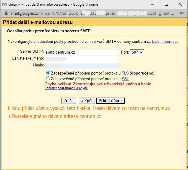 S částí před zavináčem a SSL 465 to píše Server je nedostupný. Zkontrolujte server a číslo portu. Navýšení schránky?