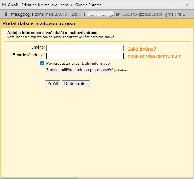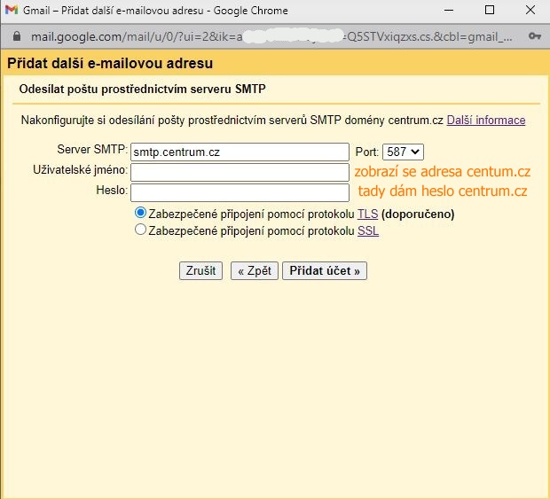 Zdravím. Už nevím co kde dělám špatně. Propojil jsem si Gmail s Centrum.cz. Zprávy z Centrum už mi automaticky chodí do Gmailu. Jak ale nastavit abych z gmailu mohl nové emaily posílat z adresy Centrum.cz? Snad je to na fotkách srozumitelné.