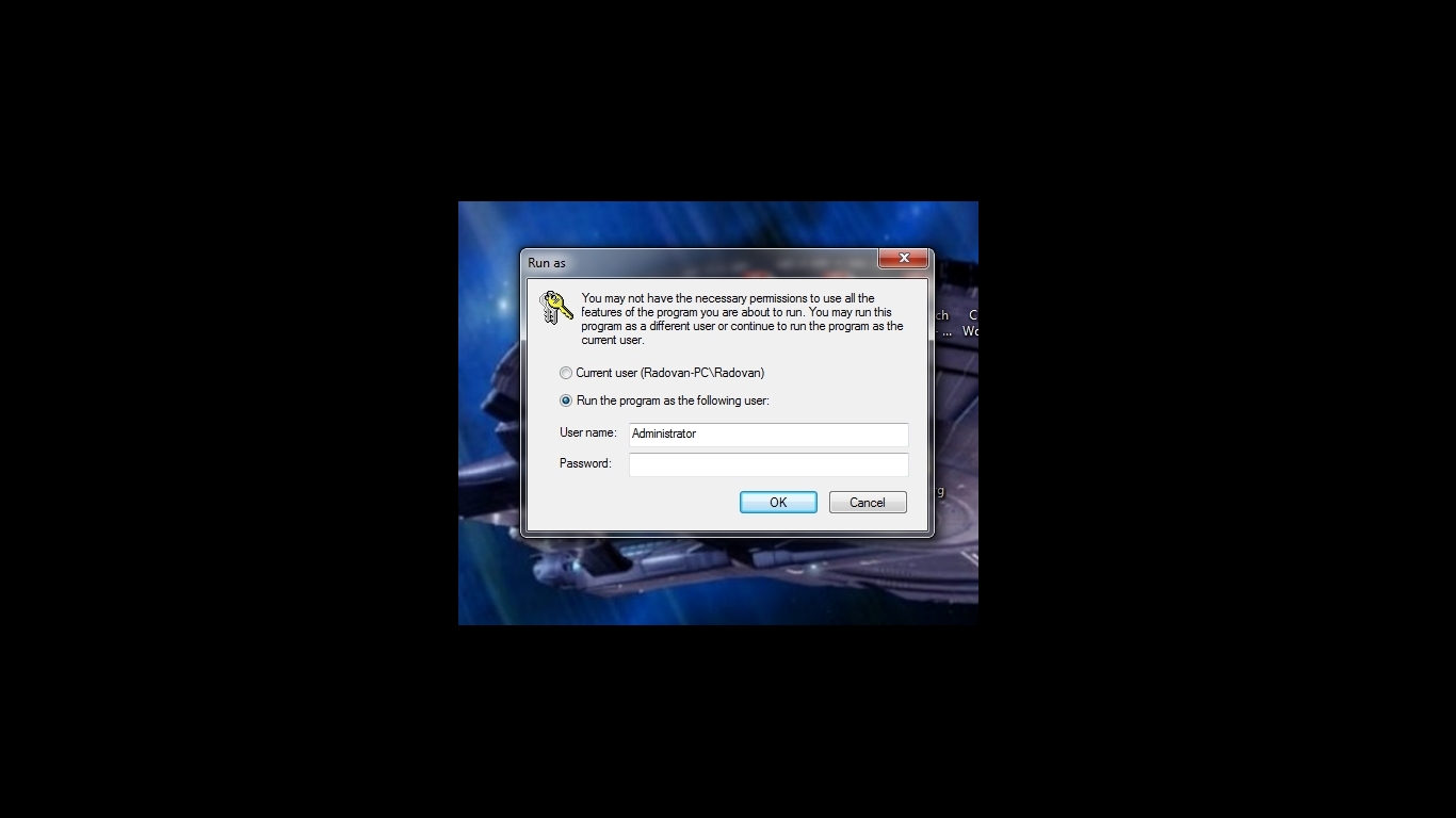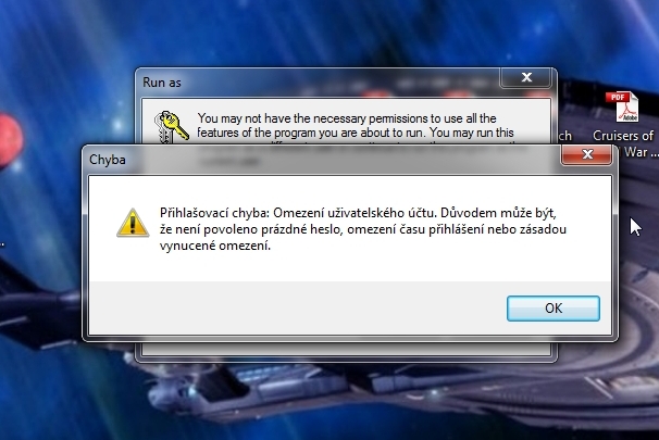 Humorné je, že já jako User bych měl být podle nastavení Win7 také Administrátorem a vůbec netuším, jaké heslo je vyžadováno. Pokud si zaškrtnu "Other User", instalace nepokračuje.
