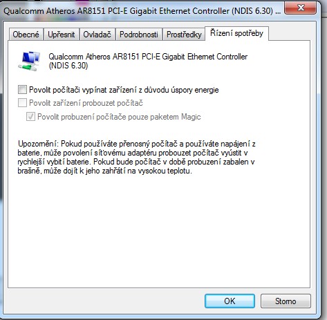 Jeste se podivej na nastaveni napajeni toho adapteru (ve Spravci zarizeni i v Moznostech napajeni), zda nejsou zapnute nejake setrici funkce.