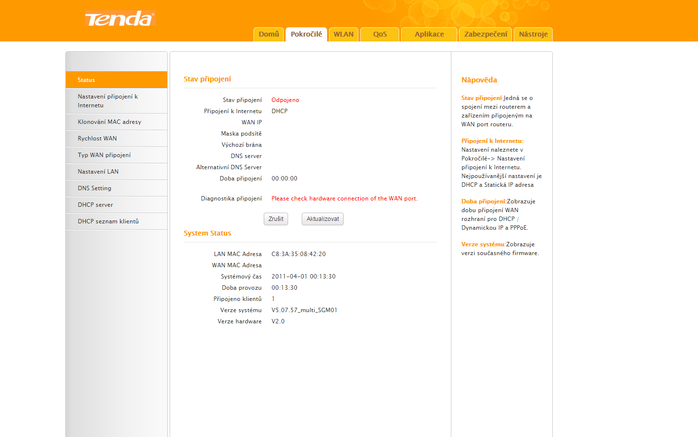 dobrý den jsem v tom úplný lajk takže... koupil sem modem tenda w308r a zapojil na kabel který vede k nám domů někde z daleka, připojil k němu druhý kabel který jsem připojil k routeru, dal CD do počítače a spustil jejich program který mě přesměroval na stránku tenda kde bylo default: admin