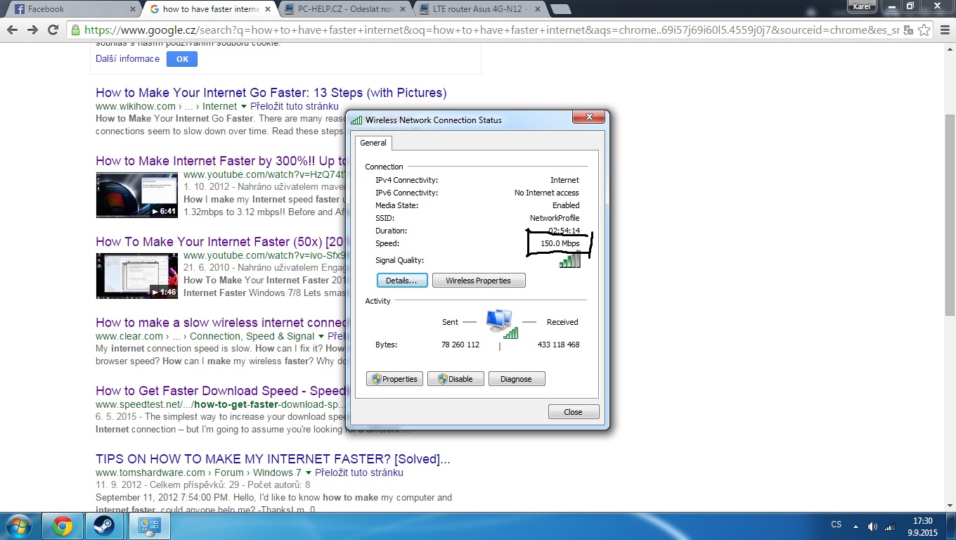 Ahoj, chtěl bych poprosit o pár rad, ohledně internetu, mám velice pomalý internet, stahuji 250kb/s a upload mám 0.30kb/s Ano velice špatné, přesto, že mám od poskytovatele (O2) placených 150Mbytes.. Nevíte jak zvýšit rychlost někdo? Děkuji