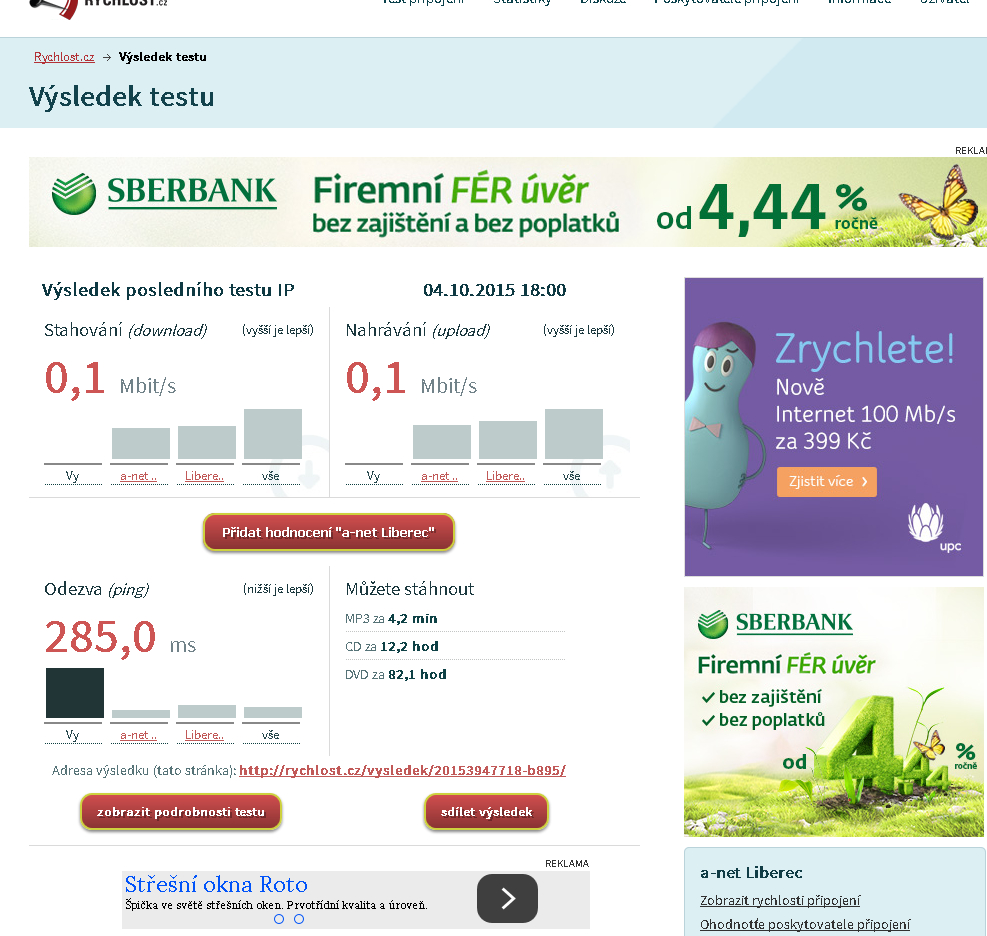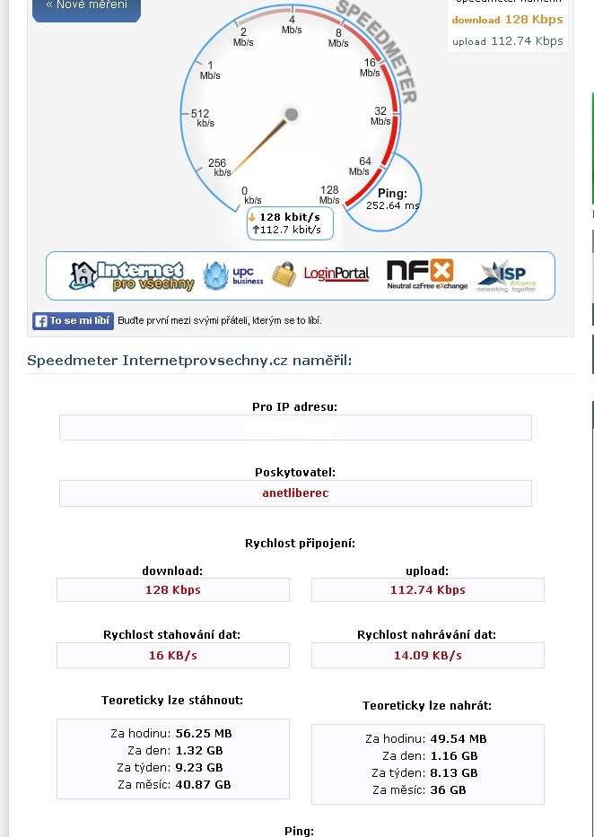 Jasny chápu "Až 5 mbit/s" ale 0,1 download a 0,1 upload je docela drzost, a jediná rada "vypojte a zapojete adapter" nebo " mi se na to podívame vzdáleně." Připojení funguje týden a zase zvedám mobil řeším to samy pořád dokola. Wi-Fi to není, mám antenu na balkoně a kabelem je to propojeny ke mně do PC. Připojení A-net Liberec. To i v centru je lepší připojeni na net než u mě doma.