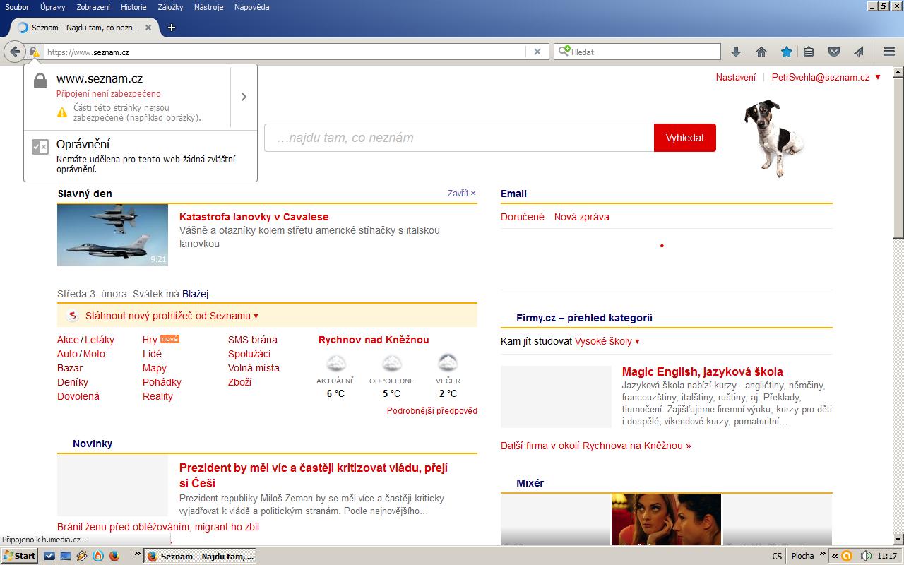 už od rána mi nechce při spuštění prohlížeče(IE i Firefox) načíst "Seznam" nahlásí problém se spojením a bla bla bla. Když dám záložku, tak to jede normálně, zobrazí ji. V nastavení na domovsou stánku(seznam) jsem se koukal a je to v pořádku. Zkoušel jsem to v 6 hod, v 10 hod, i teď a prostě se nenačte. Dcera jede na jiném NB přes WiFi a jí to nezlobí. Máte nějaká řešení nebo nápad,co s tím. Včera večer to jelo normálně, až do vypnutí. Dík Petr