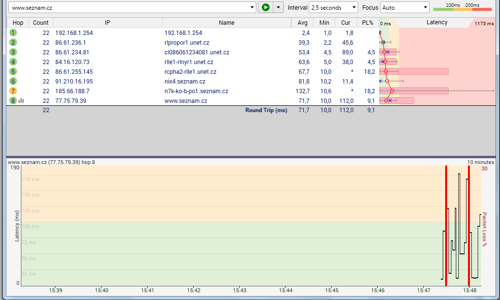 Připojení přes kabel na to nemá vliv. Přidávám screen z PingPlotteru. Je problém u mě a nebo u poskytovatele?