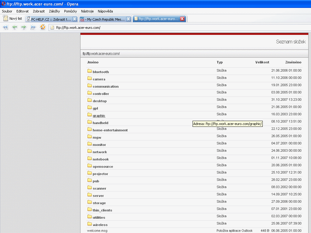 Zdravim. Najednou mi přestalo fungovat připojení na jakékoliv ftp přes prohlížeč (např. na ftp://ftp.work.acer-euro.com se vůbec nedostanu). Nefunguje ani v Opeře 9.5 ani v IE7. Vůbec nevim, čím by to mohlo být. Zkoušel jsem vypnout antivir a firewall a nepomohlo. Přes FTP klienty to ale funguje. Díky za rady.