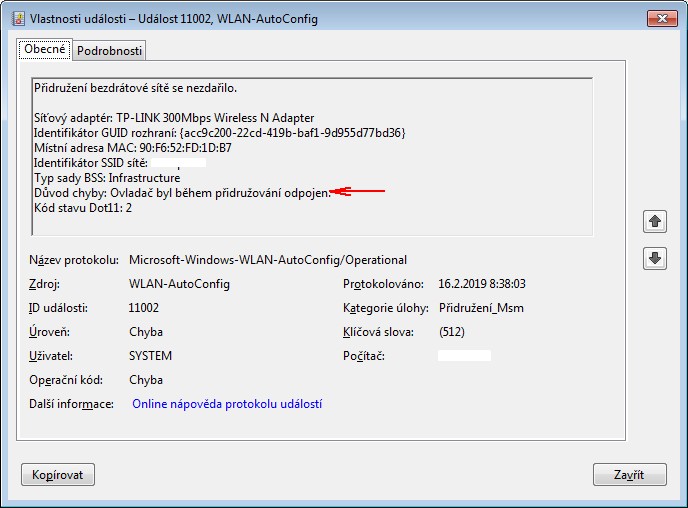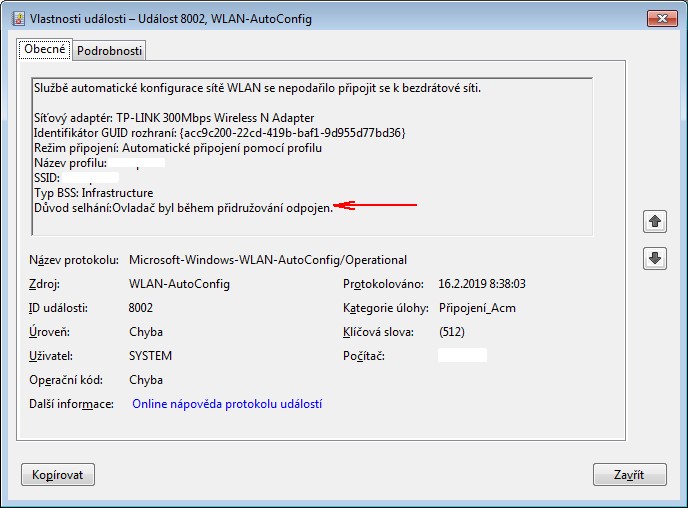 Na výpisu wifi ovladače bylo napsáno něco ve smyslu, že byl "odpojen, protože byl zastaven". Asi jsem včas neudělal PRTSCRN.