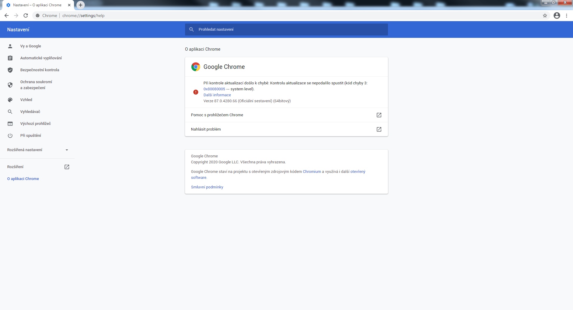 Zkusil jsem teď nainstalovat i Google Chrome a vyskytl se podobný problém, viz. obr. níže. Pro jistotu jsem ještě nainstaloval Firefox. Takže, Opera a Firefox fungují včetně aktualizací. Nový Edge a Chrome fungují, ale při manuálním pokusu o aktualizaci vyhodí chybu: