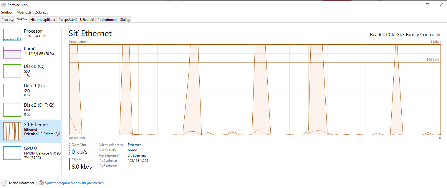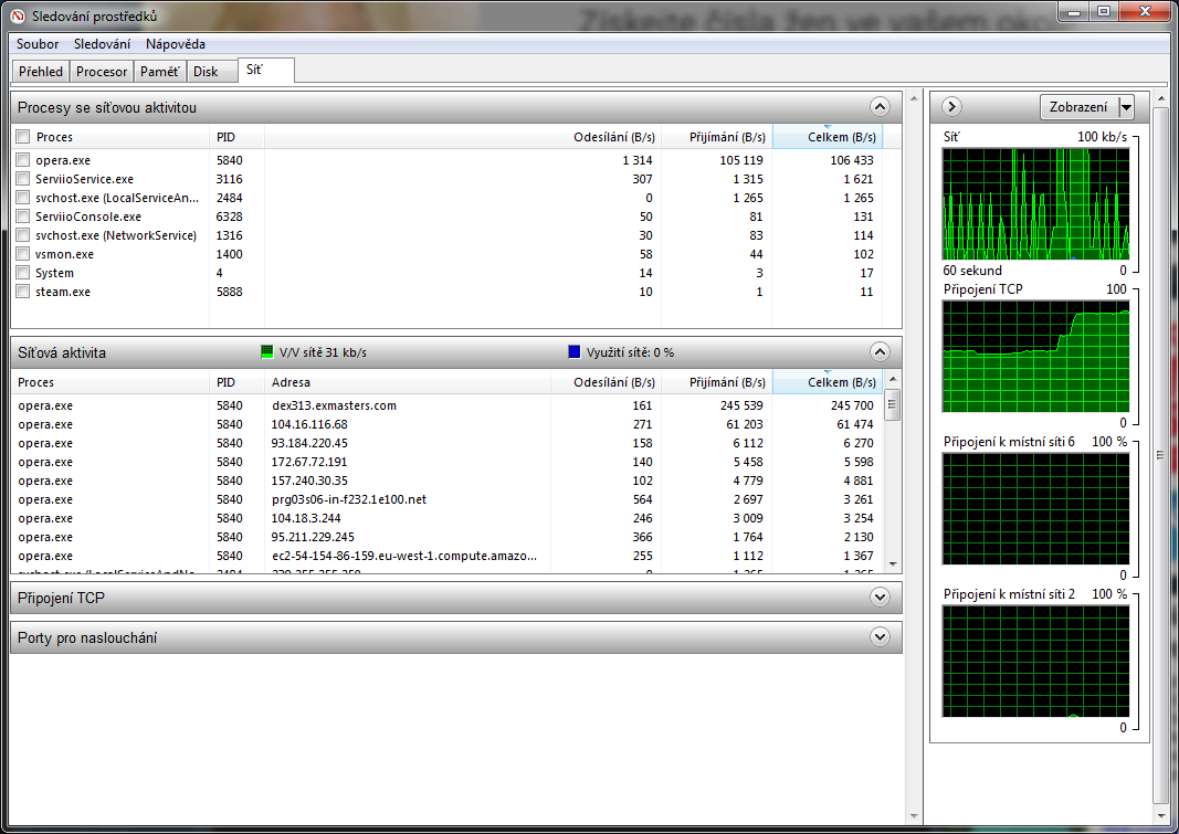 Zkus spustit sledování prostředků. Přepni na záložku síť a seřaď procesy podle síťové aktivity. Uvidíme, zda se nějaký proces objeví.