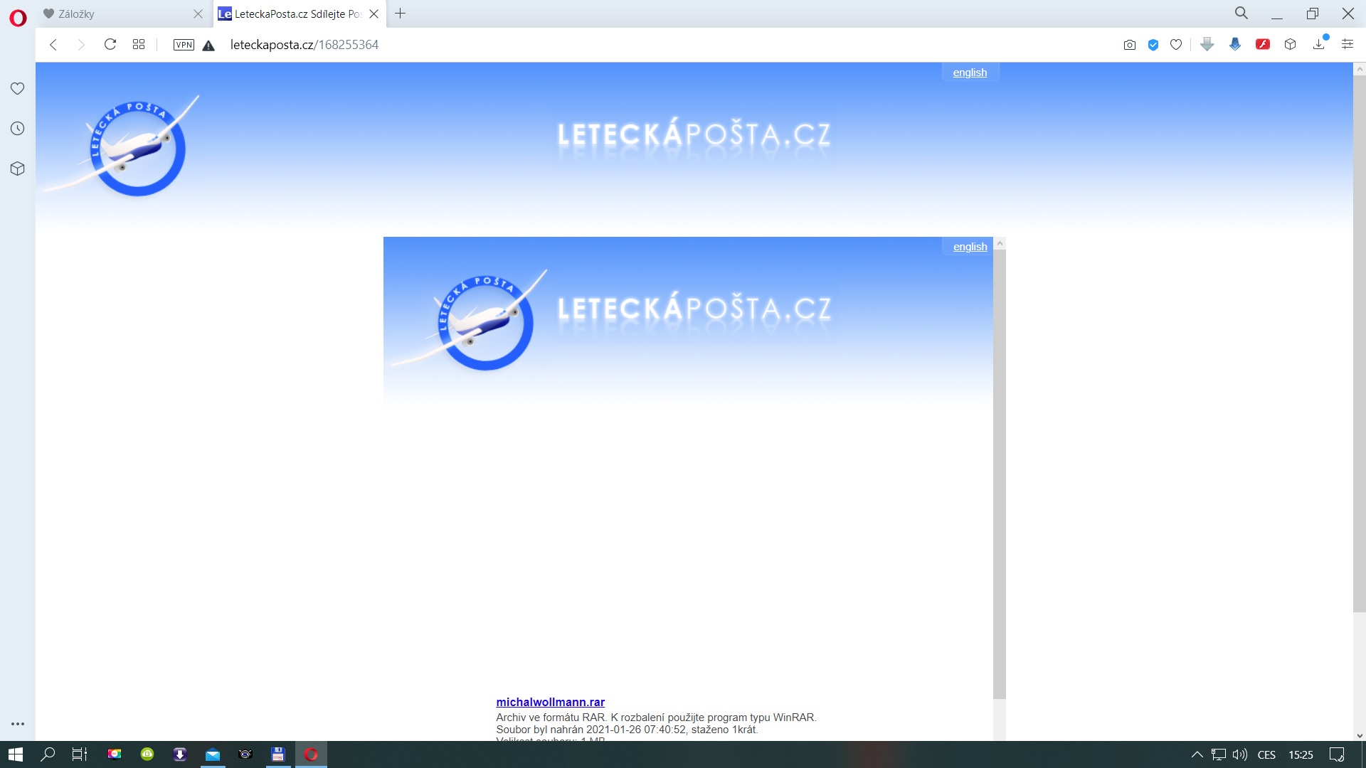 Kliknutím na odkaz se otevře okno letecké pošty s odkazem na uložený soubor. Po kliknutí tento odkaz se ve stejném okně otevře další okno se stejným obsahem a další klikání na odkaz na soubor v tomto dalším okně už nic nedělá.