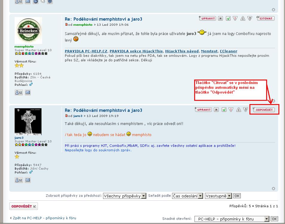 Po instalaci MODu se tlačítko Citace v posledním příspěvku automaticky mění na tlačítko Odpovědět (viz. obrázek níže).