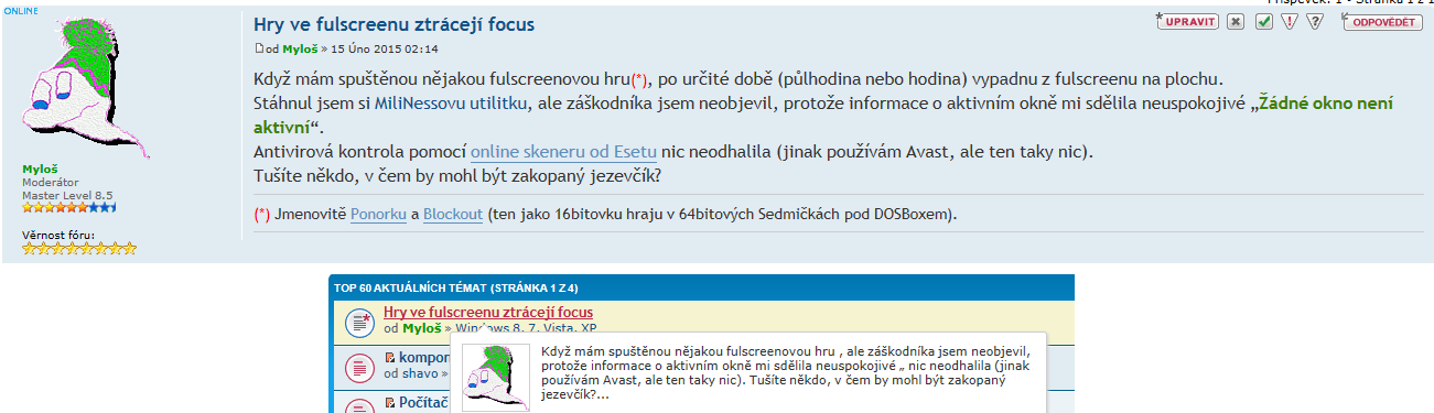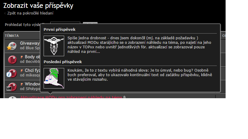 S MODem byly vážné potíže a tak mi autor MODu poskytnul alternativní kód pro rozklad příspěvků....sám potvrdil, že jde o rychlé řešení, které má určité potíže s rozkladem složitých příspěvků s bbkódem a že s řádnou opravou teprve přijde. Za jak dlouho netuším, odhadoval bych tak za 1-2 měsíce... Do té doby se budeme muset spokojit, v případě složitých příspěvků, se zmiňovanými 6 nohami...Myloš píše:Koukám, že to z textu vybírá náhodná slova:Je to úmysl, nebo bug? Osobně bych preferoval, aby to ukazovalo kontinuální text od začátku příspěvku, klidně ve stávajícím rozsahu.
