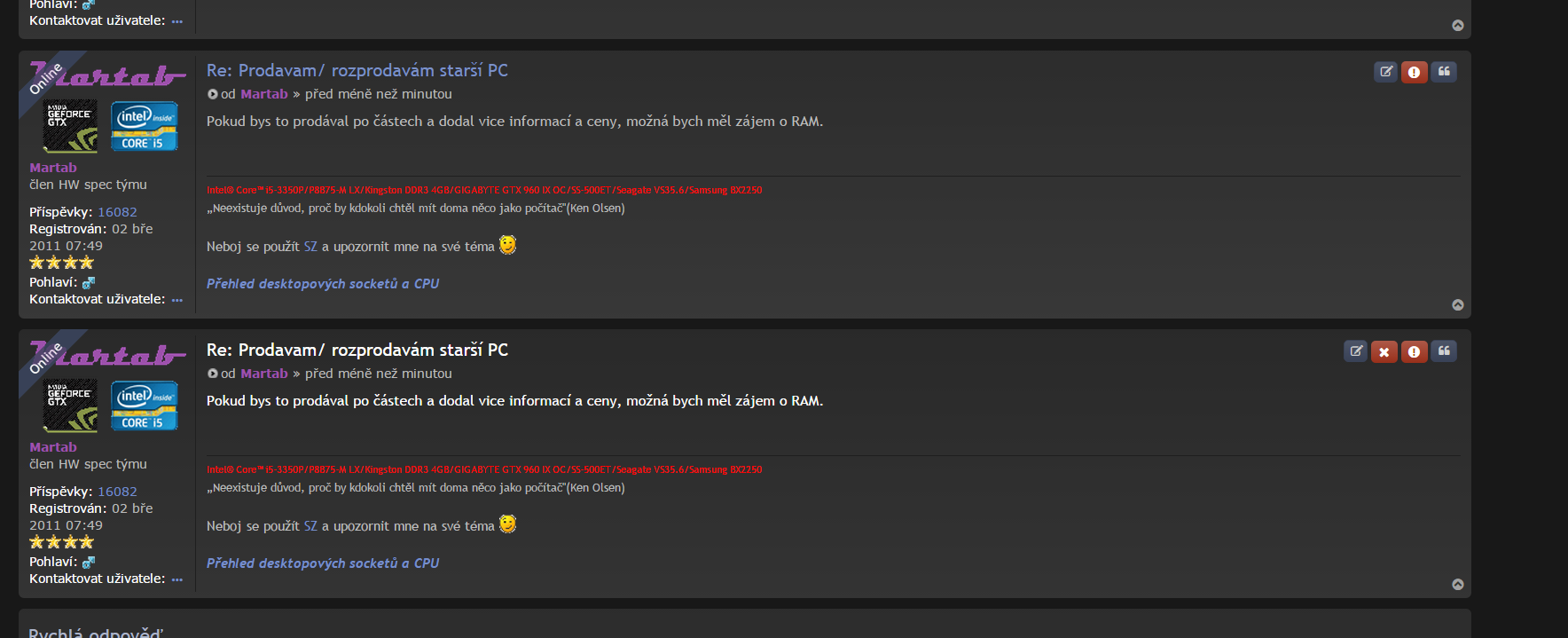 V SZ řeším jen záležitosti týkající se fóra. Na prosby a žádosti o technickou podporu nereaguji. Díky za pochopení.