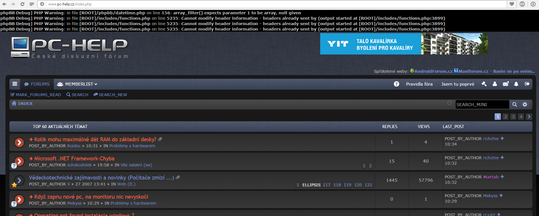 Pardon, to jsme zapomněl napsat, stalo se mi to dneska ráno na noťasu s Firefoxem a Linuxem (verzi bych se musel podívat), a teď na PC s Operou a Windows. AJ není normální, mám klasicky češtinu, AJ se zobrazuje spolu s chybou. Nastalo to po kluku na "Fóra" v plovoucí liště.