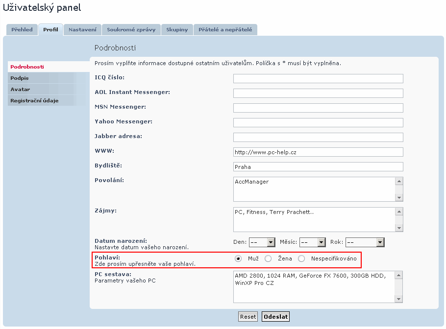a některá si kvůli tomu dokonce musela změnit nick. Naopak chlapci/kluci/chlapy problém asi neměli, ale i ti mohou novou fci využít... Informaci o pohlaví naleznete ve svém profilu, v záložce Profil >> Podrobnosti viz. obrázek níže. Zde je to možné i nastavit.