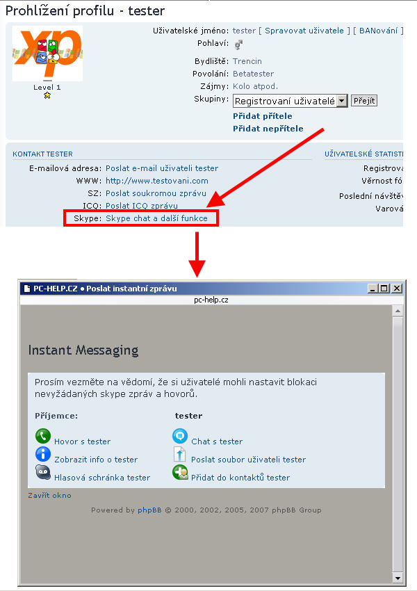 - adresu vašeho Skype zadáte do políčka Skype ve vašem profilu (poté se automaticky začne zobrazovat všem ostatním, registrovaným uživatelům), ve svém profilu rovněž určíte, zda-li se má v tématu po kliknutí na ikonku Skype spustit Hovor nebo Chat