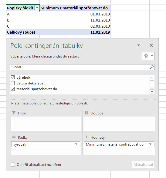 Ahojte, již nějaký čas hledám zjednodušení v mé manuální práci. Kontroluju, zda se pro daný výrobek nepoužil "čerstvější" materiál. Pro představu přikládám excel. Byl bych vděčný za jakýkoliv nápad, vzorec, VBA ... který by dokázal dopsat sloupec D.