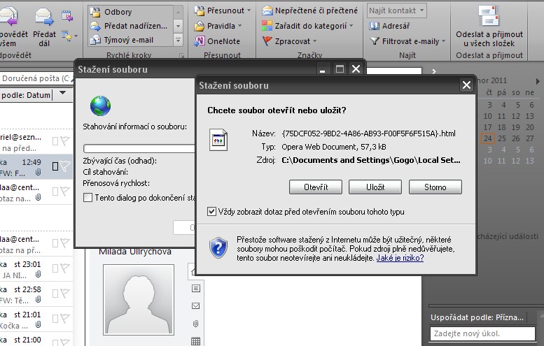 Chci li cokoliv provést se zprávou staženou v Microsoft Outlook 2010, zobrazí se dialog pro stažení html souboru. Po jeho otevření se zobrazí v prohlížeči Opera odkazy na zprávy odesílatele. Jak nastavit, aby se tento dialog neobjevoval a ani se nic nestahovalo?