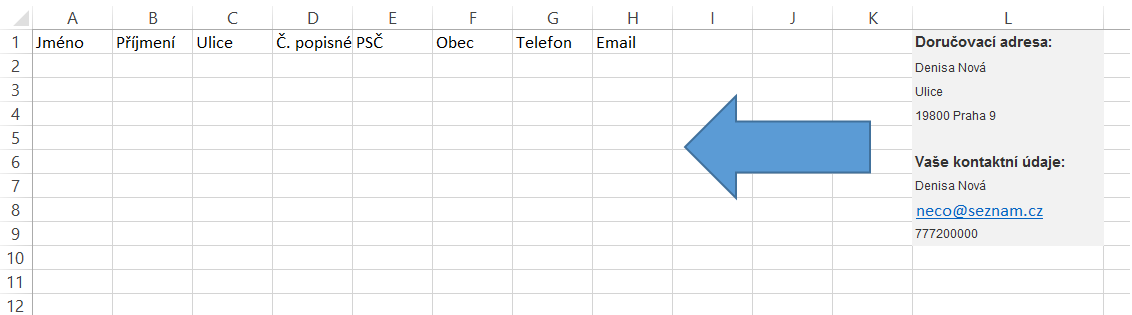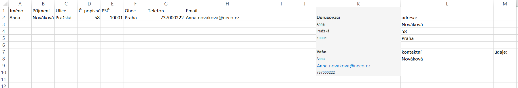 Jsou zde sloupce Jméno, Příjmení, Ulice, Číslo, PSČ, Město, Telefon a Email. Dále mám adresu zkopírovanou "jedním klikem" z emailu v této podobě: