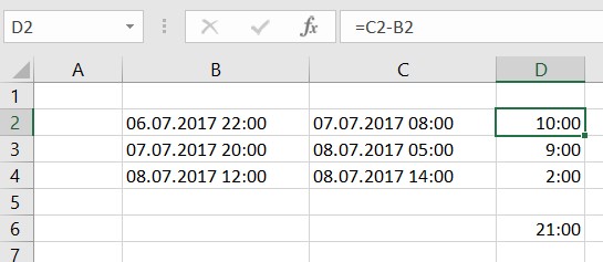 Mám MS Office, ale podle mě je to stejné až na drobnosti. Já bych to řešil přes půlnoc i s datem. Prostě formát dd.mm.yyyy hh:mm pro čas OD i DO. Hodiny, jak se již psalo, bych udělal jako rozdíl DO minus OD, formát buňky hh:mm a pod tím jen sumační řádek. Viz obrázek.