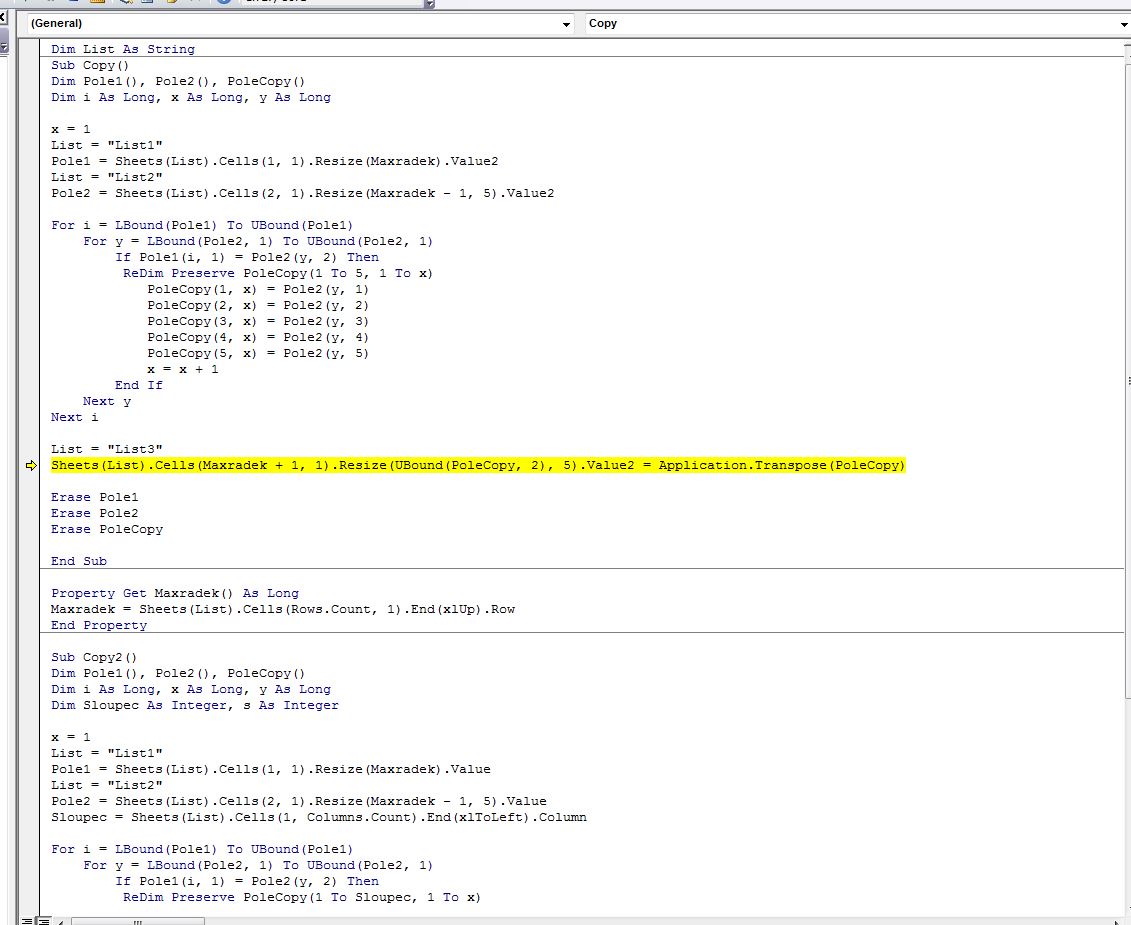 Obě procedury Copy i Copy2 pro zjištění posledního obsazeného řádku na jednotlivých listech používají proceduru Property Get Maxradek()