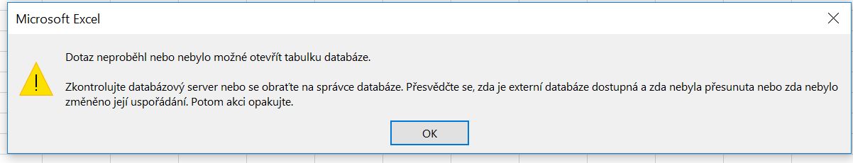 udělala jsem vše podle návodu až do bodu 7 ale při pokusu o spuštění dotazu mi to hodilo chybovou hlášku viz příloha. Stejný dotaz jsem spustila v SQL a vše funguje, takže mám pravděpodobně nějakou chybu v připojení toho excelu