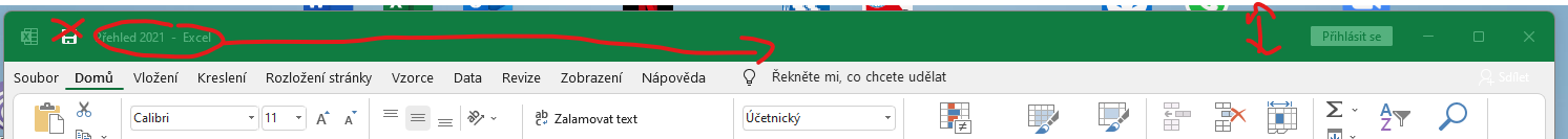 V podstatě by horní lišta měla vypadat tak že v levém rohu by měl být logo sešitu excel, v polovině šíře okna název souboru a měla by být užší (tlačítko vypnutí, minimalizace a maximalizace je v porovnání celkově velké). Ikona uložit by tam neměla být