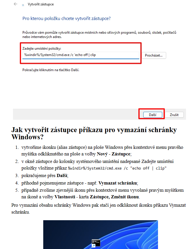 Asi zde dělám něco špatně, ale nefunguje mi to. Stále vkládám text z Calcu. Mám v tom zapsání chybu? %windir%/System32/cmd.exe /c 'echo off | clip' Zkoušela jsem varianty s " (dvojité uvozovky) místo jednoduchých, jen tu na začátku (dle obrázku), přidat ji za clip, ...